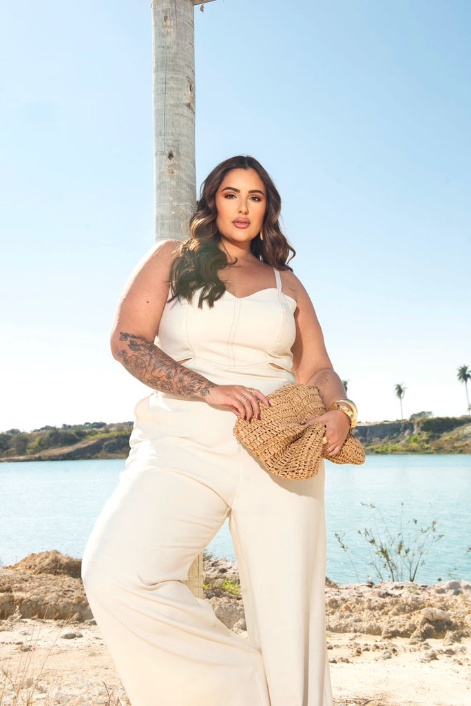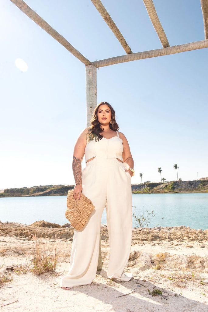 Macacão com pespontos contrastantes, alças reguláveis, busto ajustado com lastex nas costas, recorte abaixo do busto e calça com bolsos faca. Confeccionado em tecido sensoriale.